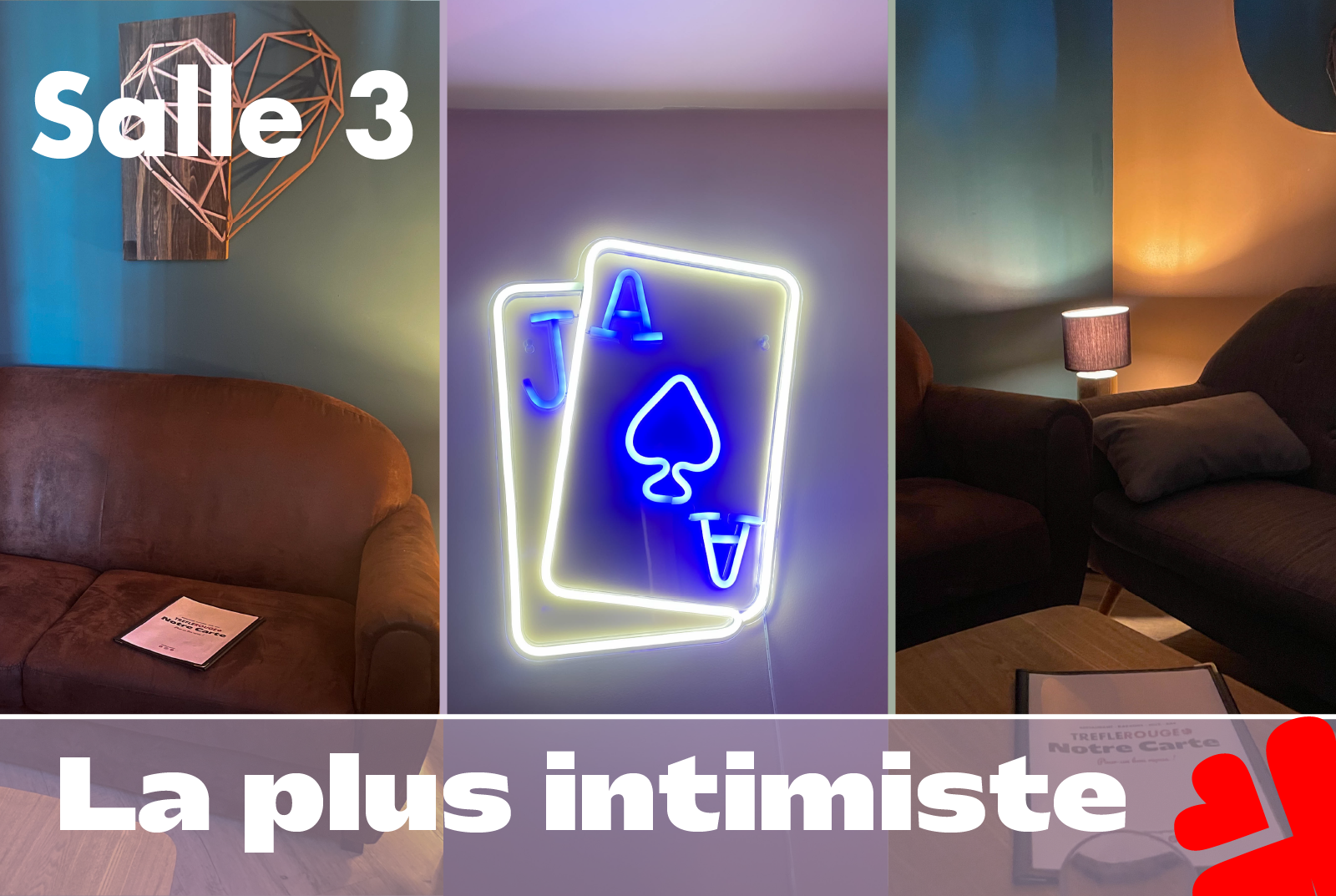 Parfaite pour un date original, une soirée entre colocs ou un petit groupe d’amis proches, la Salle 3 est aussi très appréciée pour des surprises romantiques. Le service Trèfle Rouge reste évidemment disponible : planches, tapas, cocktails et desserts livrés dans la salle sans déranger votre bulle.